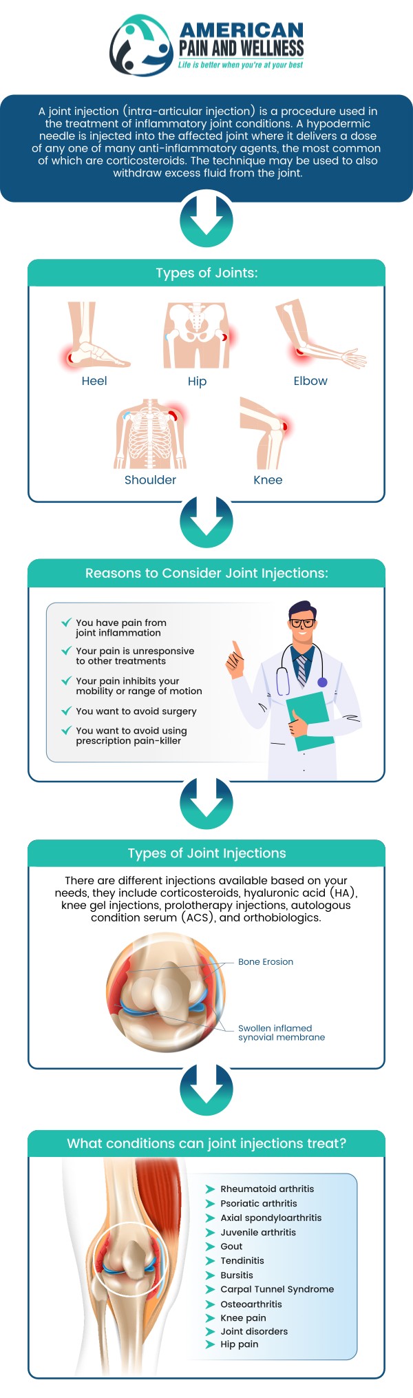 Joint pain injections near you offer a convenient, effective way to manage pain and inflammation in affected areas like knees, shoulders, or hips. These injections can provide quick relief and improve joint function, making daily activities more comfortable without the need for surgery. If you have joint pain, trust the professionals at American Pain and Wellness to provide you with relief. We have convenient locations to serve you in Allen and Plano, TX. For more information, contact us or request an appointment online.