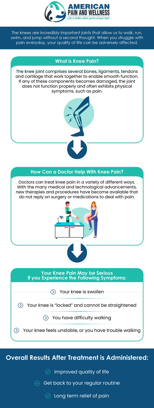 At American Pain and Wellness, our experienced pain specialist in Allen, TX, and Plano TX, offers an array of treatment options to help you relieve your knee pain symptoms including swelling and stiffness, crunching noises, and inability to straighten the knee. For more information, please call us.